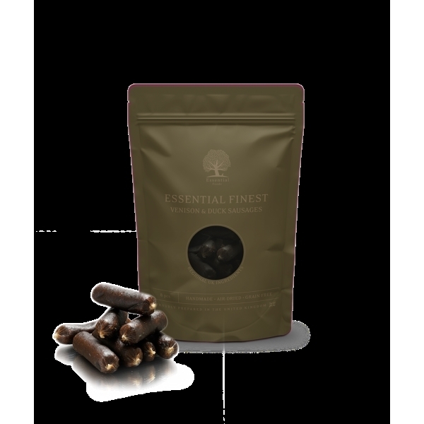Vi har fundet Essential Finest Venison Duck Sausages Stk fra Essential Foods hos Hunde-foder.dk i kategorien Godbidder. En lækker godbid til hunden med smag af vildt og and