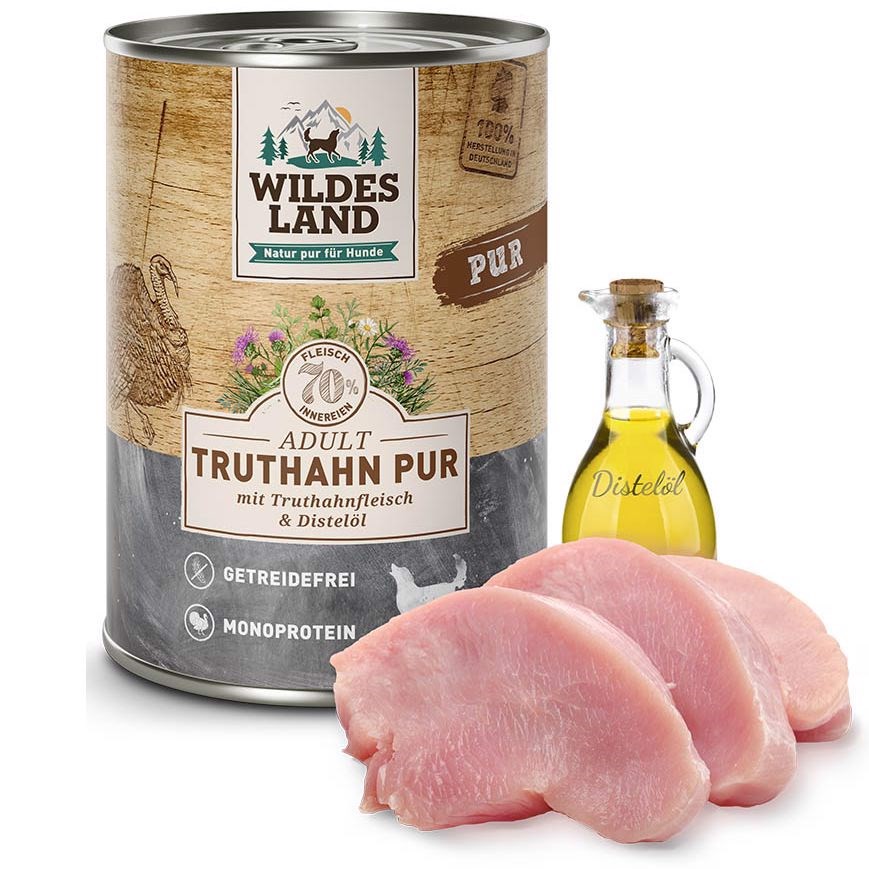 Vi har fundet Wildes Land Pur Kalkun Dåsemad G fra Wildes Land hos Hunde-foder.dk i kategorien Wildes Land Hundefoder. Kornfrit og højt optageligt dåsemad med 1 proteinkilde i form af kalkunkød